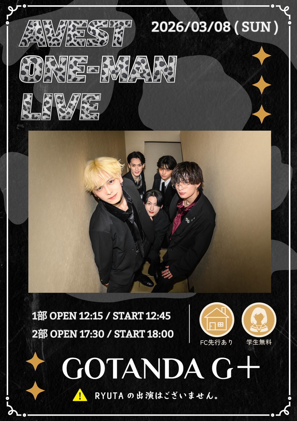 3/8(日) AVEST ワンマンライブ @GOTANDA G+ ※RYUTAの出演はございません。